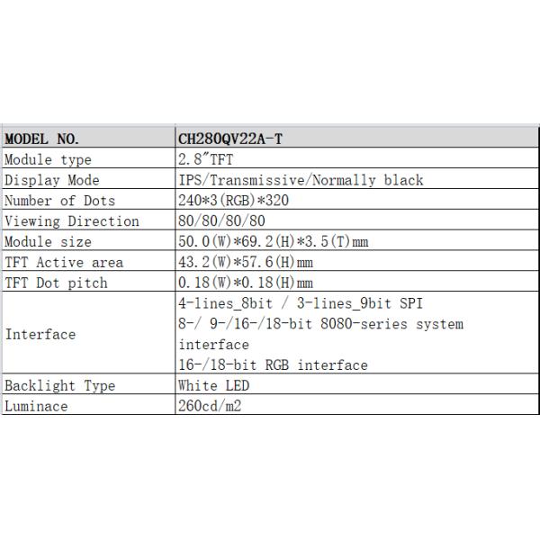 Interface : 4-lines_8bit / 3-lines_9bit SPI 8-/ 9-/16-/18-bit 8080-series system interface 16-/18-bit RGB interface